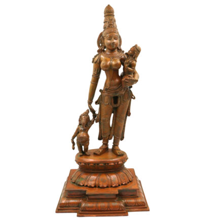 Handcrafted Panchaloha Parvati Ganesh Murugan Idol | South Indian Divine Parivar Sculpture in Bronze – Gauri with Vinayaka and Skanda, Gold, 19.5 Inch, 1 Piece