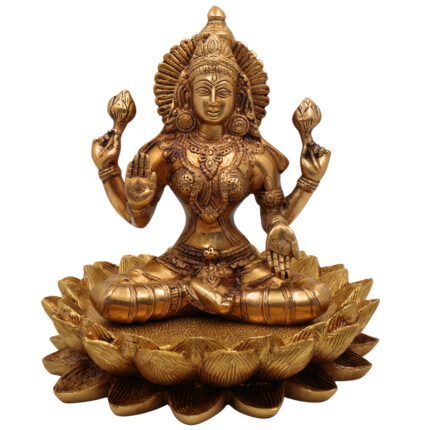 Brass Lakshmi on Lotus Idol, Shri Maha Lakshmi Maa Murti, Padma Lakshmi Statue, Mahalakshmi Figurine for Puja, Home Decor & Gifts, Gold, 10 Inch, 1 Piece