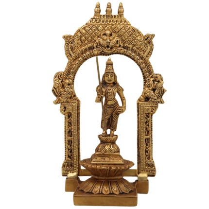 Brass Murugan Idol with Prabhavali, Kartikeya Subramanya Skanda Shanmuga Velan Statue for Home Temple, Pooja & Decor, Handcrafted Peetal Pital Subrahmanya Vigraham,Gold, 10.5 Inch, 1 Piece