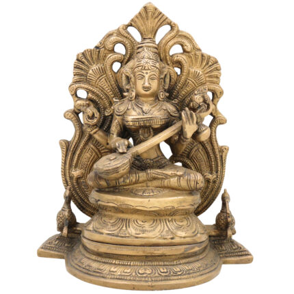 Brass Saraswati Idol Peetal Sharada Devi Statue Vani Vagdevi Murti for Pooja Room Home Temple Decor, Gold, 8 Inch, 1 Piece