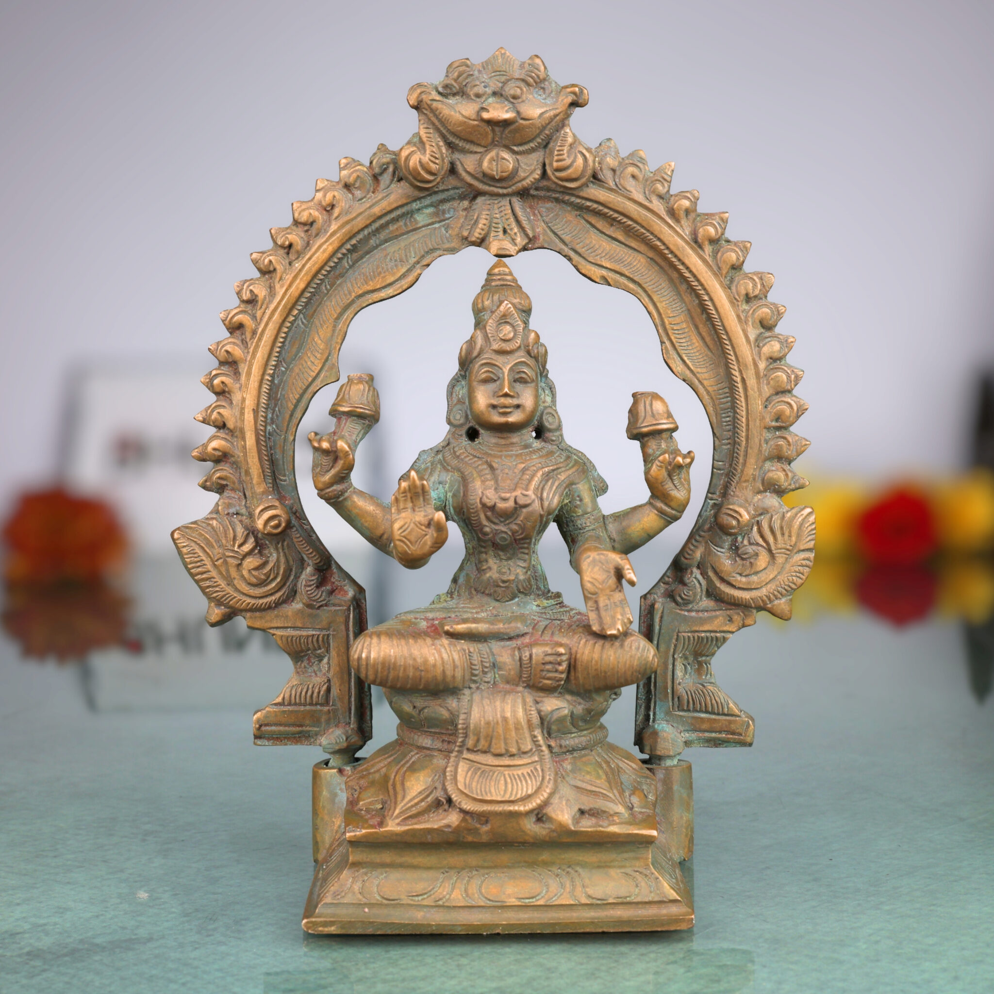 At Bhunes, we specialize in reviving timeless Indian artistry through each handcrafted creation. This Maha Lakshmi bronze idol is sculpted using the traditional lost-wax casting method and crafted in accordance with the Shilpa Shastras, ensuring authenticity in both material and spirit. The sculpture is made using the sacred Panchaloha alloy—a divine mix of bronze, copper, tin, silver, and gold—believed to attract positive energy, balance, health, fortune, and prosperity. Every curve and feature of this Chola-style bronze Lakshmi murti reflects South Indian heritage and temple art precision.
