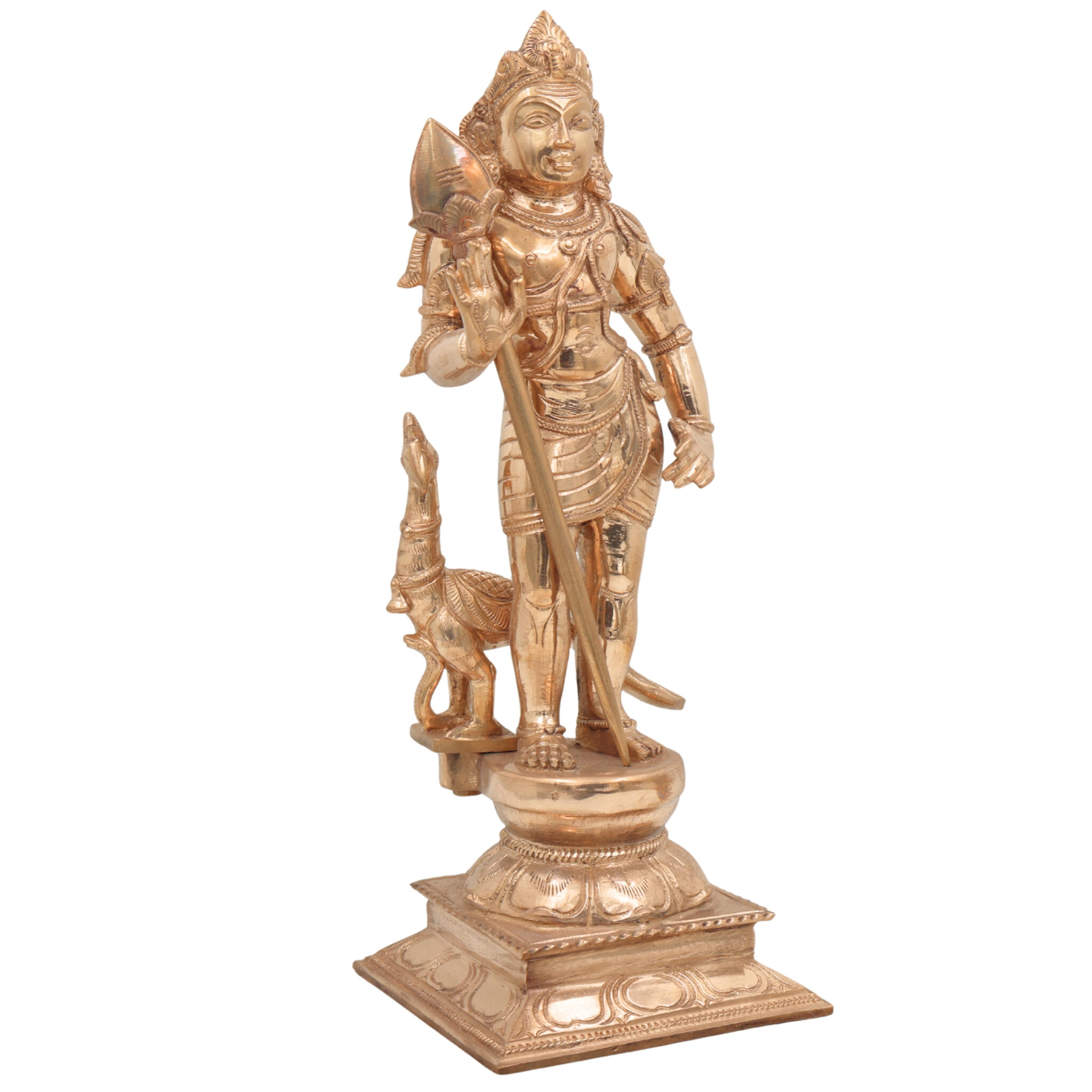 Murugan, also known as Skanda, Karthikeya, Subramaniam, Arumugan, Velan, and Mahasena, is the eternal warrior son of Lord Shiva and Goddess Parvati. Revered as the God of War, Wisdom, and Victory, he embodies courage, divine knowledge, and righteousness. His six faces (Shanmukha) and spear (Vel) symbolize protection, power, and enlightenment. Worshipping this bronze Subramanya idol is said to eliminate fear, remove obstacles, and bless devotees with strength and success.