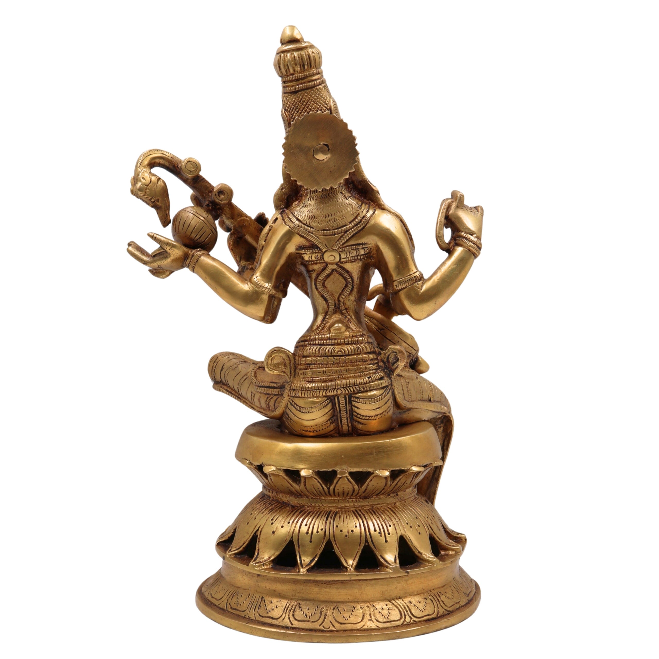 Goddess Saraswati (also spelled Sarasvati) is the Hindu goddess of knowledge, music, flowing water, wisdom, learning, art, speech, abundance, and wealth. She is one of the Tridevi, along with Lakshmi and Parvati. Revered across India under names such as Shyamala, Brahmani, Brahmi, Bharadi, Vani, Vachi, Varnesvari, Kavijihvagravasini, Sharada, Savitri, Vagdevi, Vidyadatri, Veenavadini, Pustakadharini, Veenapani, Hamsavahini, Ambika, Bharati, Chandrika, Devi, Gomati, Hamsasana, Saudamini, Shvetambara, Subhadra, Vaishnavi, Vasudha, Vidya, Vidyarupa, Vindhyavasini, Chaduvula Thalli, Sharadamba, Kalaimagal, Namagal, Kalaivani, Sarada, Veena-pustaka-dharini, Vagishvari, Varadhanayaki, Gayatri, Thurathadi, Tipitaka Medaw, Benzaiten, Suratsawadi, Saratsawadi, Matangi, Vidhya Devi, Srutadevata, Vagisvari, Nila Devi, Yangchenma, Mahavidhya Tara, Saraswathi and more. This Brass Saraswati Idol brings spiritual energy, knowledge, creativity, and prosperity to any environment.
