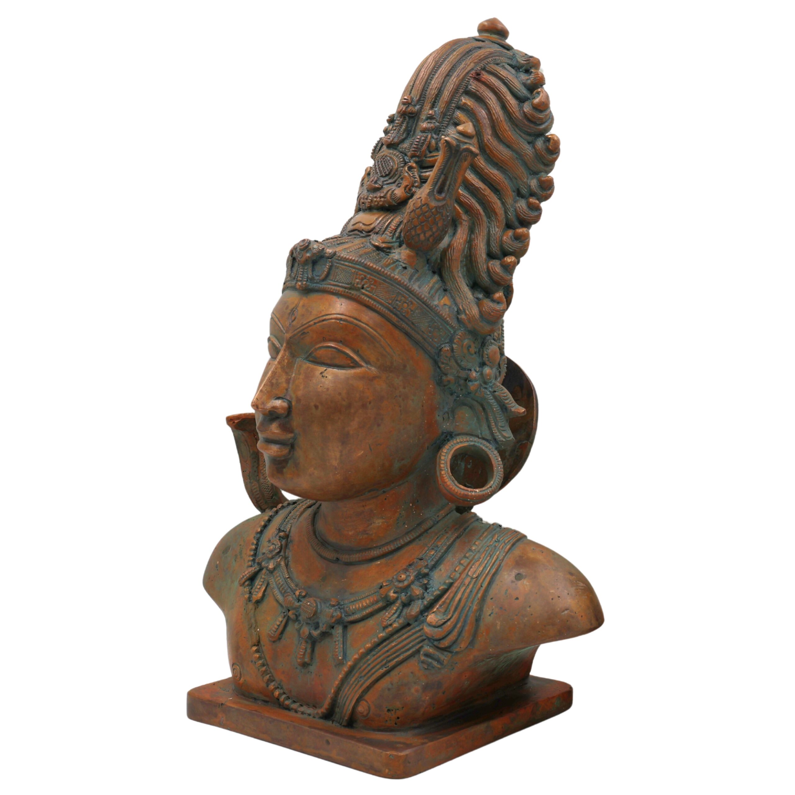 This captivating Shiva Head is completely handmade using the traditional lost-wax casting method, adhering strictly to the ancient principles of the Shilpa Shastras. It is crafted from a sacred Panchaloha alloy, a divine blend of five metals – Bronze, Copper, Tin, Silver, and Gold – believed to bring spiritual balance, health, prosperity, and divine energy into the space it occupies. The sculpture reflects Chola bronze artistry, known for its precision, depth, and spiritual expression.