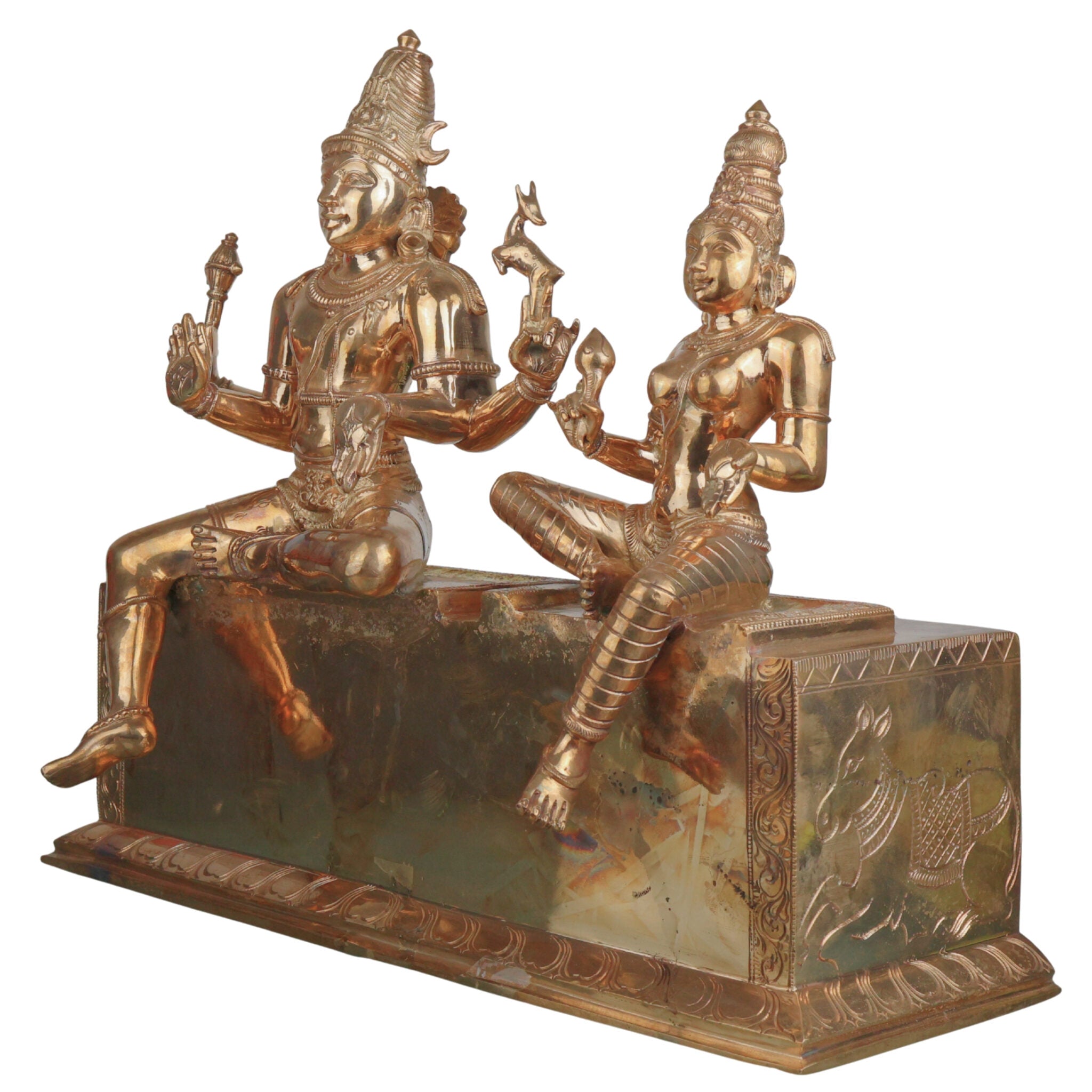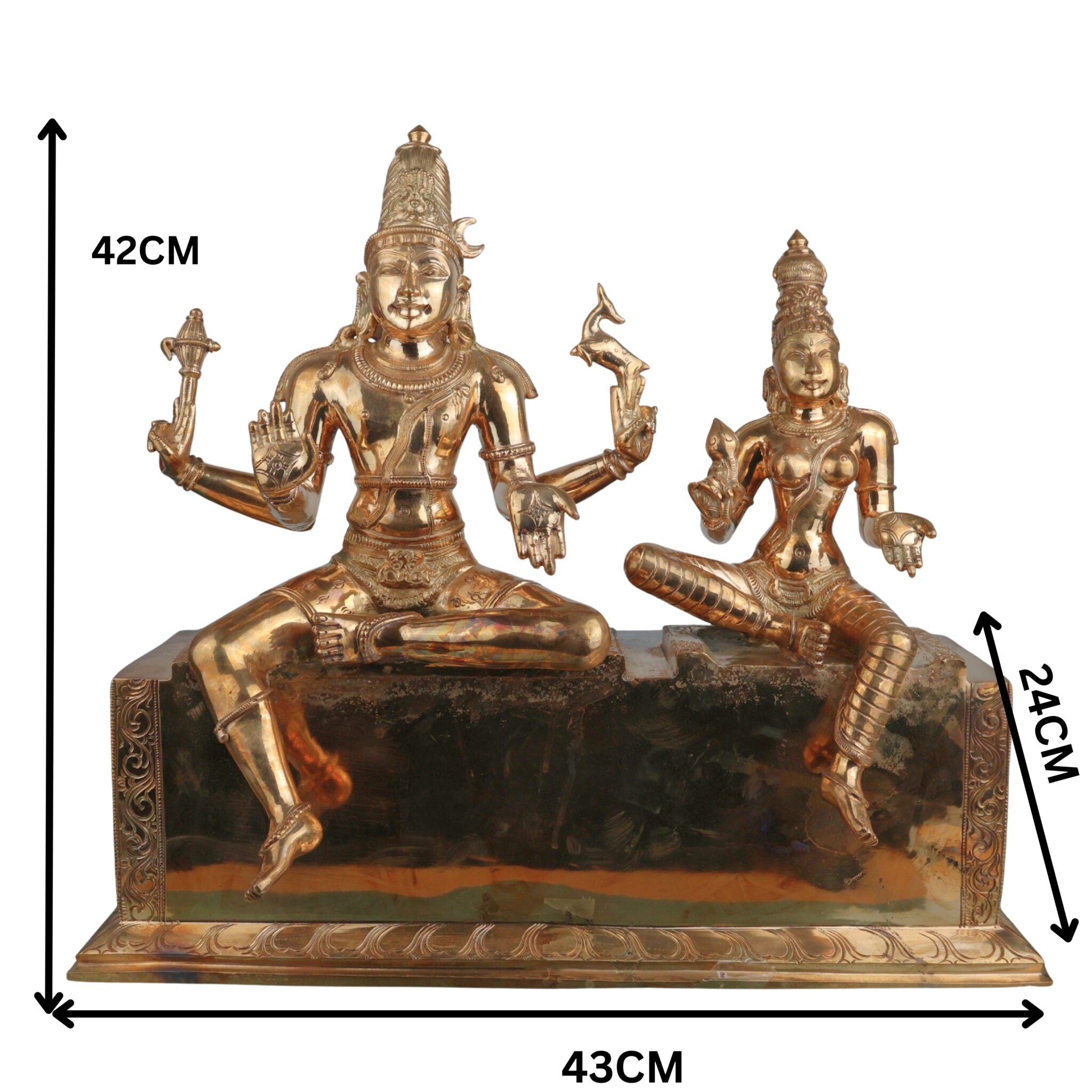 Handcrafted Bronze Shiva Parvati Idol Umamaheshwara Gauri Shankar Shiv Shakti Vigraham Chola Art South Indian Temple Sculpture, Gold, 16.5 Inch, 1 Piece